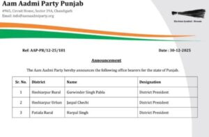 🚩 ਆਮ ਆਦਮੀ ਪਾਰਟੀ ਪੰਜਾਬ ਨੇ ਐਲਾਨੇ 3 ਨਵੇਂ ਜ਼ਿਲ੍ਹਾ ਪ੍ਰਧਾਨ ਚੰਡੀਗੜ੍ਹ, 31 ਦਸੰਬਰ