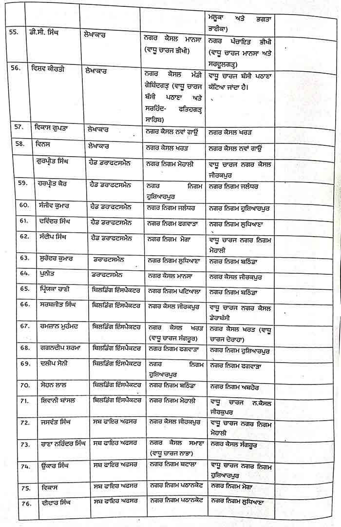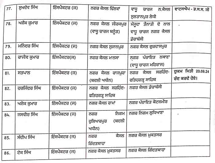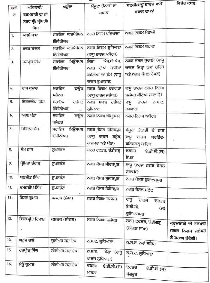 ਜਲੰਧਰ, 30 ਅਗਸਤ – ਨਿਊਜ਼ਲਾਈਨ ਐਕਸਪ੍ਰੈਸ – ਪੰਜਾਬ ਸਰਕਾਰ ਨੇ ਇੱਕ ਹੁਕਮ ਜਾਰੀ ਕਰਕੇ ਸਥਾਨਕ ਸਰਕਾਰਾਂ ਵਿਭਾਗ ਦੇ 86 ਅਧਿਕਾਰੀਆਂ ਅਤੇ ਹੋਰ ਮੁਲਾਜ਼ਮਾਂ ਦੇ ਤਬਾਦਲਿਆਂ ਸੰਬੰਧੀ ਹੁਕਮ ਜਾਰੀ ਕੀਤੇ ਹਨ। ਇਹ ਹੁਕਮ ਤੁਰੰਤ ਪ੍ਰਭਾਵ ਨਾਲ ਲਾਗੂ ਹੋਣਗੇ।