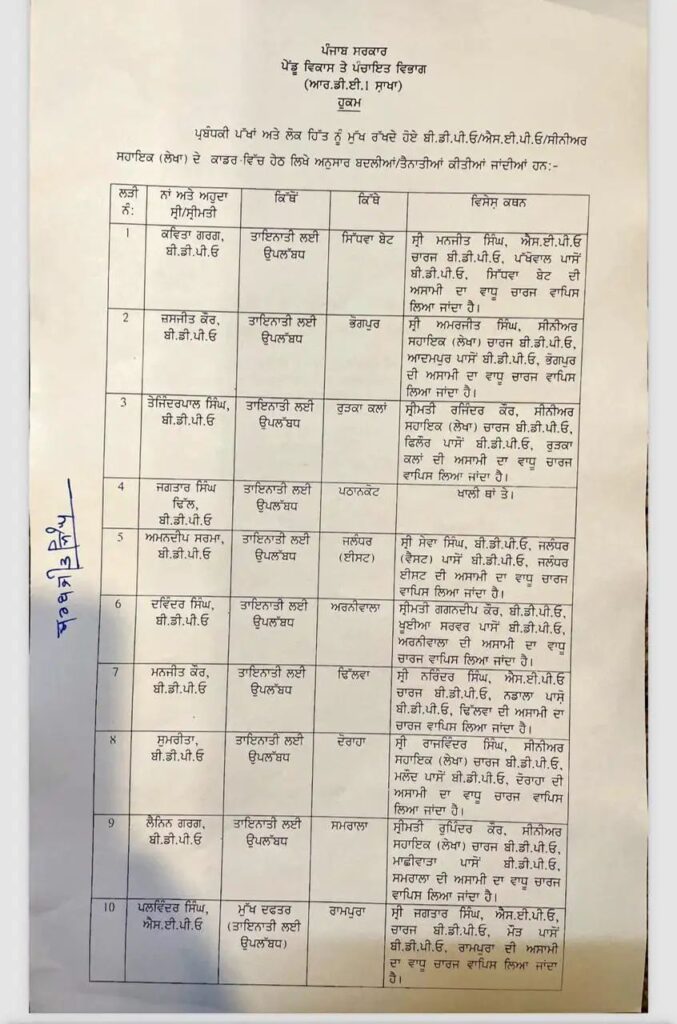 ਚੰਡੀਗੜ, 23 ਸਤੰਬਰ – ਨਿਊਜ਼ਲਾਈਨ ਐਕਸਪ੍ਰੈਸ – ਪੰਜਾਬ ਸਰਕਾਰ ਨੇ ਪੰਚਾਇਤੀ ਚੋਣਾਂ ਨੂੰ ਮੁੱਖ ਰੱਖਦਿਆਂ ਵੱਡੇ ਪੱਧਰ ‘ਤੇ ਬੀਡੀਪੀਓ/ ਐਸਈਪੀਓਜ਼ ਦੀਆਂ ਬਦਲੀਆਂ ਕੀਤੀਆਂ ਹਨ। ਇਨ੍ਹਾਂ ਬਦਲੀਆਂ ਤਹਿਤ 9 BDPO ਤੇ 2 SEPOs ਦੀਆਂ ਬਦਲੀਆਂ ਕੀਤੀਆਂ ਹਨ। Author: Newslineexpres@1 transfer 0 comment 0 FacebookTwitterPinterestEmail Newslineexpres@1 previous post ???? 143 ਪੁਲਿਸ ਅਧਿਕਾਰੀਆਂ ਦੇ ਤਬਾਦਲੇ ਅਤੇ ਨਿਯੁਕਤੀਆਂ next post E-paper 24 September Related Articles Punjab: 4 IAS/PCS ਅਫਸਰਾਂ ਦੇ ਤਬਾਦਲੇ February 7, 2026 🚩 PIA honoured DC Patiala February 7, 2026 🚩 ਦਰਸ਼ਨ ਸਿੰਘ ਬਣੇ ਡੀ.ਸੀ. ਦਫਤਰ ਕਰਮਚਾਰੀ ਯੂਨੀਅਨ,... February 7, 2026 🚩 ਪਟਿਆਲਾ ਮਿੰਨੀ ਸਕੱਤਰੇਤ ਵਿੱਚ ਡੀ ਸੀ ਦਫ਼ਤਰ... February 7, 2026 🚩 ਪਟਿਆਲਾ ਇੰਡਸਟ੍ਰੀਅਲ ਐਸੋਸੀਏਸ਼ਨ ਵੱਲੋਂ ਡਿਪਟੀ ਕਮਿਸ਼ਨਰ ਦਾ... February 7, 2026 🚩 ਮੁੱਖ ਚੋਣ ਅਫ਼ਸਰ ਅਨਿੰਦਿਤਾ ਮਿਤਰਾ ਵੱਲੋਂ ਚੋਣਾਂ... February 6, 2026 🚩 ਮਾਡਲ ਸਕੂਲ ਦੇ ਵਿਦਿਆਰਥੀਆਂ ਨੇ ਹੁੰਮ-ਹੁਮਾ ਕੇ... February 6, 2026 🚩 ਸਿਵਲ ਡਿਫੈਂਸ ਸਿਖਲਾਈ ਅਤੇ ਸਮਰੱਥਾ ਨਿਰਮਾਣ ਯੋਜਨਾ... February 6, 2026 🚩 ਕਾਂਗਰਸ ਨੇ ਡਾ. ਨਵਜੋਤ ਕੌਰ ਸਿੱਧੂ ਨੂੰ... February 6, 2026 🚩 12 फरवरी को खालसा कॉलेज में लगेगा... February 6, 2026 Leave a Comment Cancel Reply Save my name, email, and website in this browser for the next time I comment.