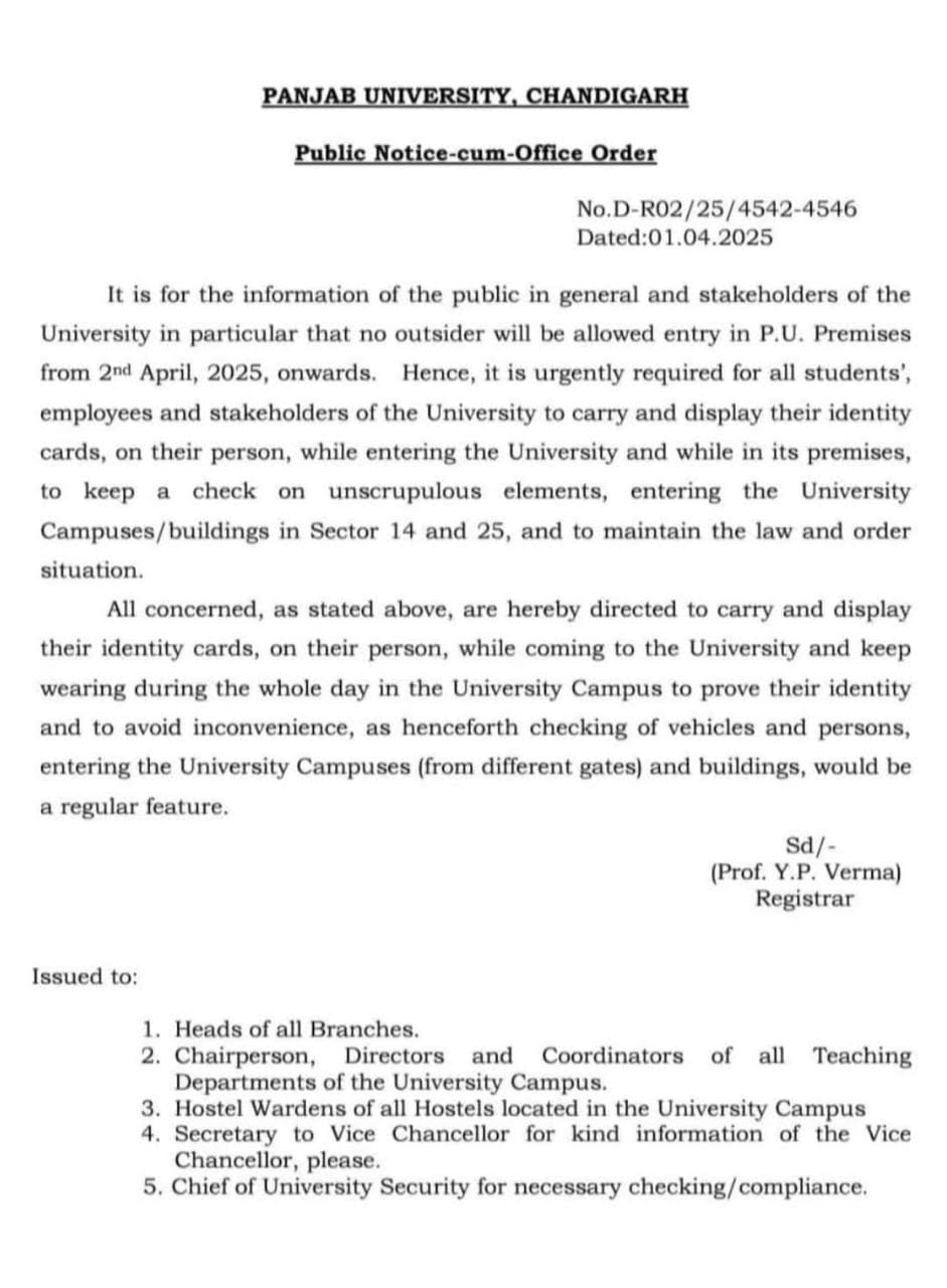 ਚੰਡੀਗੜ੍ਹ, 1 ਅਪ੍ਰੈਲ – ਨਿਊਜ਼ਲਾਈਨ ਐਕਸਪ੍ਰੈਸ – ਪੰਜਾਬ ਯੂਨੀਵਰਸਿਟੀ, ਚੰਡੀਗੜ੍ਹ ਨੇ ਸੁਰੱਖਿਆ ਨੂੰ ਲੈ ਕੇ ਇੱਕ ਵੱਡਾ ਫੈਸਲਾ ਲਿਆ ਹੈ। ਯੂਨੀਵਰਸਿਟੀ ਦੇ ਰਜਿਸਟਰਾਰ ਪ੍ਰੋਫੈਸਰ ਵਾਈ.ਪੀ. ਵਰਮਾ ਵੱਲੋਂ ਜਾਰੀ ਇੱਕ ਪੱਤਰ ਅਨੁਸਾਰ, 2 ਅਪ੍ਰੈਲ, 2025 ਤੋਂ ਬਾਹਰੀ ਆਮ ਲੋਕਾਂ ਨੂੰ ਪੰਜਾਬ ਯੂਨੀਵਰਸਿਟੀ ਦੇ ਕੈਂਪਸ ਵਿੱਚ ਦਾਖਲ ਹੋਣ ਦੀ ਇਜਾਜ਼ਤ ਨਹੀਂ ਹੋਵੇਗੀ।