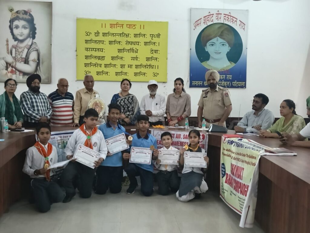 ਪਟਿਆਲਾ, 16 ਅਪ੍ਰੈਲ – ਨਿਊਜ਼ਲਾਈਨ ਐਕਸਪ੍ਰੈਸ – ਦੇਸ਼ ਵਿੱਚ ਮਣਾਏ ਜਾ ਰਹੇ ਰਾਸ਼ਟਰੀ ਫਾਇਰ ਸੇਫਟੀ ਸਪਤਾਹ ਦੇ ਸਬੰਧ ਵਿੱਚ ਫਸਟ ਏਡ ਸੇਫਟੀ ਸਿਹਤ ਜਾਗਰੂਕਤਾ ਮਿਸ਼ਨ ਵਲੋਂ ਵਿਦਿਆਰਥੀਆਂ ਨੂੰ ਅੱਗ, ਗੈਸਾਂ, ਬਿਜਲੀ ਸ਼ਾਟ ਸਰਕਟ, ਪੀੜਤਾਂ ਨੂੰ ਰੈਸਕਿਯੂ, ਫਸਟ ਏਡ, ਸੀ ਪੀ ਆਰ, ਬਣਾਉਟੀ ਸਾਹ ਕਿਰਿਆ ਕਰਕੇ ਮਰਦਿਆਂ ਨੂੰ ਬਚਾਉਣ ਦੇ ਮੁਕਾਬਲੇ ਵੀਰ ਹਕੀਕਤ ਰਾਏ ਮਾਡਲ ਸਕੂਲ ਪਟਿਆਲਾ ਵਿਖੇ ਪ੍ਰਿੰਸੀਪਲ ਸਰਲਾ ਭਟਨਾਗਰ ਦੀ ਅਗਵਾਈ ਹੇਠ ਕਰਵਾਏ ਗਏ।