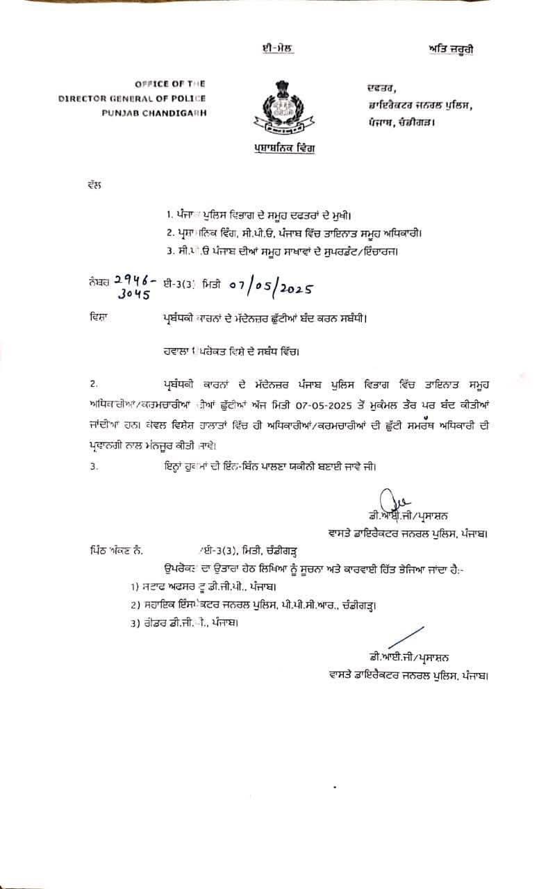 ਚੰਡੀਗੜ੍ਹ, 8 ਮਈ – ਨਿਊਜ਼ਲਾਈਨ ਐਕਸਪ੍ਰੈਸ – ਪਿਛਲੇ ਕਈ ਦਿਨਾਂ ਤੋਂ ਭਾਰਤ ਅਤੇ ਪਾਕਿਸਤਾਨ ਵਿਚਾਲੇ ਚੱਲ ਰਹੇ ਤਣਾਅ ਵਿਚਾਲੇ ਪੁਲਿਸ ਅਧਿਕਾਰੀਆਂ ਲਈ ਨਵੇਂ ਹੁਕਮ ਜਾਰੀ ਹੋਏ ਹਨ। ਜਿਸ ਤਹਿਤ ਪੁਲਿਸ ਅਫਸਰਾਂ ਅਤੇ ਮੁਲਾਜ਼ਮਾਂ ਦੀਆਂ ਛੁੱਟੀਆਂ ਰੱਦ ਕਰ ਦਿੱਤੀਆਂ ਗਈਆਂ ਹਨ। ਇਸ ਸਬੰਧੀ ਇੱਕ ਚਿੱਠੀ ਜਾਰੀ ਕੀਤੀ ਗਈ ਹੈ।ਚਿੱਠੀ ਮੁਤਾਬਕ ਅਗਲੇ ਹੁਕਮਾਂ ਤੱਕ ਪੁਲਿਸ ਮੁਲਾਜ਼ਮਾਂ ਅਤੇ ਵੱਡੇ ਅਧਿਕਾਰੀਆਂ ਦੀਆਂ ਛੁੱਟੀਆਂ ਰੱਦ ਕੀਤੀਆਂ ਗਈਆਂ ਹਨ। ਇਸ ਦੌਰਾਨ ਕਿਹਾ ਗਿਆ ਹੈ ਕਿ ਕਿਸੇ ਵੀ ਹਾਲਤ ਵਿੱਚ ਛੁੱਟੀ ਨਹੀਂ ਮਿਲੇਗੀ, ਜਦ ਤੱਕ ਬਹੁਤ ਜ਼ਿਆਦਾ ਜ਼ਰੂਰੀ ਨਾ ਹੋਵੇ। ਪੰਜਾਬ ਪੁਲਿਸ ਦੇ ਡਾਇਰੈਕਟਰ ਜਨਰਲ ਗੌਰਵ ਯਾਦਵ ਦੇ ਦਫ਼ਤਰ ਵੱਲੋਂ ਜਾਰੀ ਪੱਤਰ ਨੰਬਰ 2946-3045-E-3(3) ਵਿੱਚ ਲਿਖਿਆ ਗਿਆ ਹੈ ਕਿ ਪ੍ਰਬੰਧਕੀ ਕਾਰਨਾਂ ਕਰਕੇ ਪੰਜਾਬ ਪੁਲਿਸ ਵਿਭਾਗ ਵਿੱਚ ਤਾਇਨਾਤ ਸਮੂਹ ਅਧਿਕਾਰੀਆਂ ਅਤੇ ਕਰਮਚਾਰੀਆਂ ਦੀਆਂ ਛੁੱਟੀਆਂ ਬੁੱਧਵਾਰ 7 ਮਈ ਤੋਂ ਪੂਰੀ ਤਰ੍ਹਾਂ ਬੰਦ ਕਰ ਦਿੱਤੀਆਂ ਗਈਆਂ ਹਨ। ‘ਜਿਹੜਾ ਵੀ ਛੁੱਟੀ ‘ਤੇ ਗਿਆ ਹੈ ਉਹ ਮੁਲਾਜ਼ਮ ਅਤੇ ਅਧਿਕਾਰੀ ਡਿਉਟੀ ‘ਤੇ ਵਾਪਸਿ ਪਰਤਣ,ਚਾਹੇ ਉਹ ਕੋਈ ਸਿਪਾਹੀ ਹੋਵੇ, ਹੌਲਦਾਰ ਹੋਵੇ ਜਾਂ ਫਿਰ ਕਿਸੇ ਵੀ ਰੈਂਕ ‘ਤੇ ਹੋਵੇ ਉਹ ਡਿਉਟੀ ‘ਤੇ ਰਹੇ।’