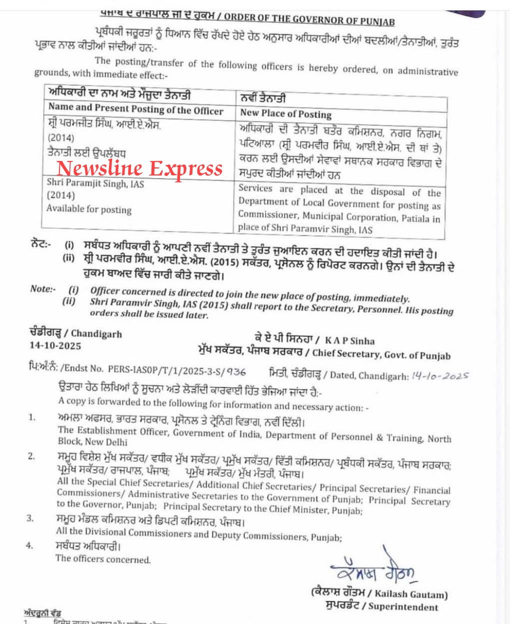 เจเฉฐเจกเฉเจเฉเฉเจน, 14 เจ เจเจคเฉเจฌเจฐ : เจจเจฟเจเจเจผเจฒเจพเจเจจ เจเจเจธเจชเฉเจฐเฉเจธ – เจชเฉฐเจเจพเจฌ เจฆเฉ เจฐเจพเจเจชเจพเจฒ เจฆเฉ เจนเฉเจเจฎเจพเจ เจเจคเฉย เจเจ เจ เจเจธ เจ เจซเจผเจธเจฐ เจชเจฐเจฎเจเฉเจค เจธเจฟเฉฐเจ เจฆเจพ เจคเจฌเจพเจฆเจฒเจพ เจเฉเจคเจพ เจเจฟเจ เจนเฉเฅค
