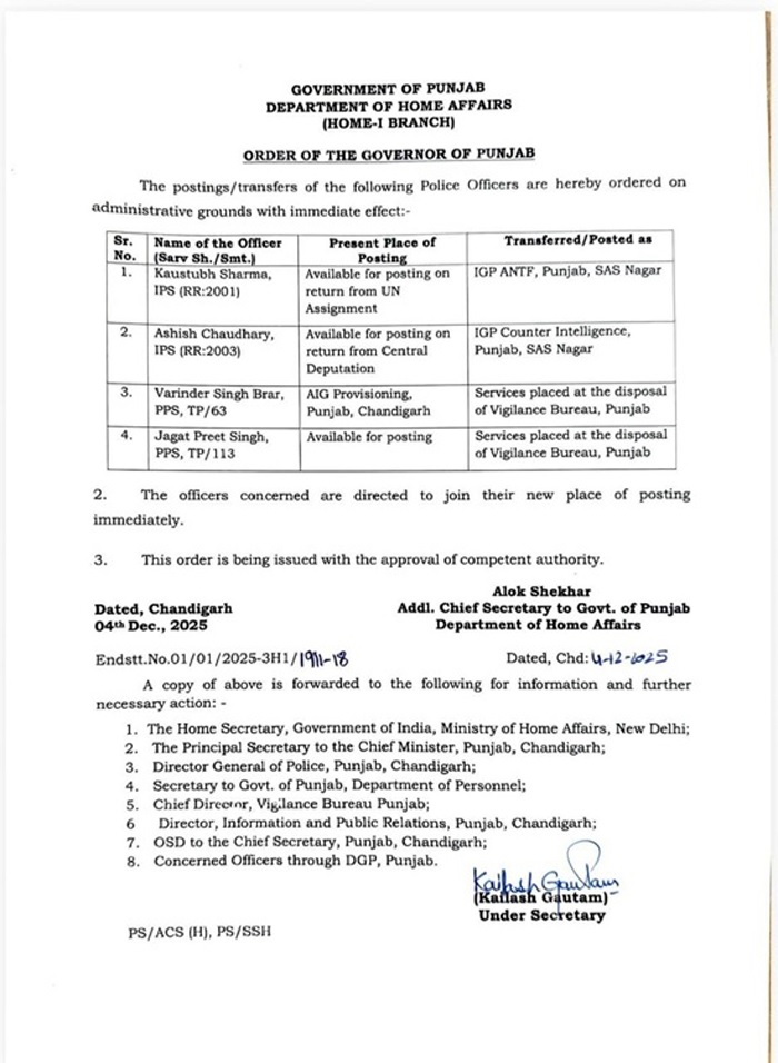 4 ਦਸੰਬਰ, ਚੰਡੀਗੜ੍ਹ – ਨਿਊਜ਼ਲਾਈਨ ਐਕਸਪ੍ਰੈਸ – ਪੰਜਾਬ ਸਰਕਾਰ ਨੇ ਤੁਰੰਤ ਪ੍ਰਭਾਵ ਨਾਲ 4 ਆਈਪੀਐੱਸ/ਪੀਪੀਐੱਸ ਅਫਸਰਾਂ ਦਾ ਤਬਾਦਲਾ ਕਰ ਦਿੱਤਾ ਹੈ। ਪੰਜਾਬ ਸਰਕਾਰ ਦੇ ਗ੍ਰਹਿ ਵਿਭਾਗ ਨੇ ਅੱਜ 4 IPS/PPS ਅਧਿਕਾਰੀਆਂ ਦੇ ਤਬਾਦਲੇ ਅਤੇ ਨਵੀਂ ਤਾਇਨਾਤੀ ਦੇ ਹੁਕਮ ਜਾਰੀ ਕਰ ਦਿੱਤੇ ਗਏ ਹਨ। ਜਾਰੀ ਹੁਕਮਾਂ ਮੁਤਾਬਕ, ਕੌਸਤੁਭ ਸ਼ਰਮਾ ਨੂੰ IGP ANTF ਪੰਜਾਬ, SAS ਨਗਰ ਤਾਇਨਾਤ ਕੀਤਾ ਗਿਆ ਹੈ। ਉਥੇ ਹੀ ਅਸ਼ੀਸ਼ ਚੌਧਰੀ ਨੂੰ IGP ਕਾਊਂਟਰ ਇੰਟੈਲੀਜੈਂਸ ਪੰਜਾਬ SAS ਨਗਰ ‘ਚ ਨਵਾਂ ਚਾਰਜ ਮਿਲਿਆ ਹੈ।