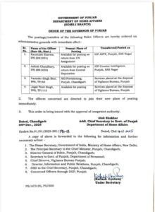 ਵਰਿੰਦਰ ਸਿੰਘ ਬਰਾੜ ਦੀਆਂ ਸੇਵਾਵਾਂ ਨੂੰ ਵਿਜੀਲੈਂਸ ਬਿਊਰੋ, ਪੰਜਾਬ ਦੇ ਹਵਾਲੇ ਕੀਤਾ ਗਿਆ ਹੈ। ਉਥੇ ਹੀ ਜਗਤ ਪ੍ਰੀਤ ਸਿੰਘ ਨੂੰ ਵੀ ਵਿਜੀਲੈਂਸ ਬਿਊਰੋ ‘ਚ ਤਾਇਨਾਤ ਕੀਤੀ ਗਿਆ ਹੈ। ਗ੍ਰਹਿ ਵਿਭਾਗ ਵਲੋਂ ਨੋਟੀਫਿਕੇਸ਼ਨ ‘ਚ ਹੁਕਮ ਦਿੱਤੇ ਗਏ ਹਨ ਕਿ ਸਾਰੇ ਅਧਿਕਾਰੀ ਆਪਣੀ ਨਵੀਂ ਤਾਇਨਾਤੀ ‘ਤੇ ਤੁਰੰਤ ਚਾਰਜ ਸੰਭਾਲਣ।