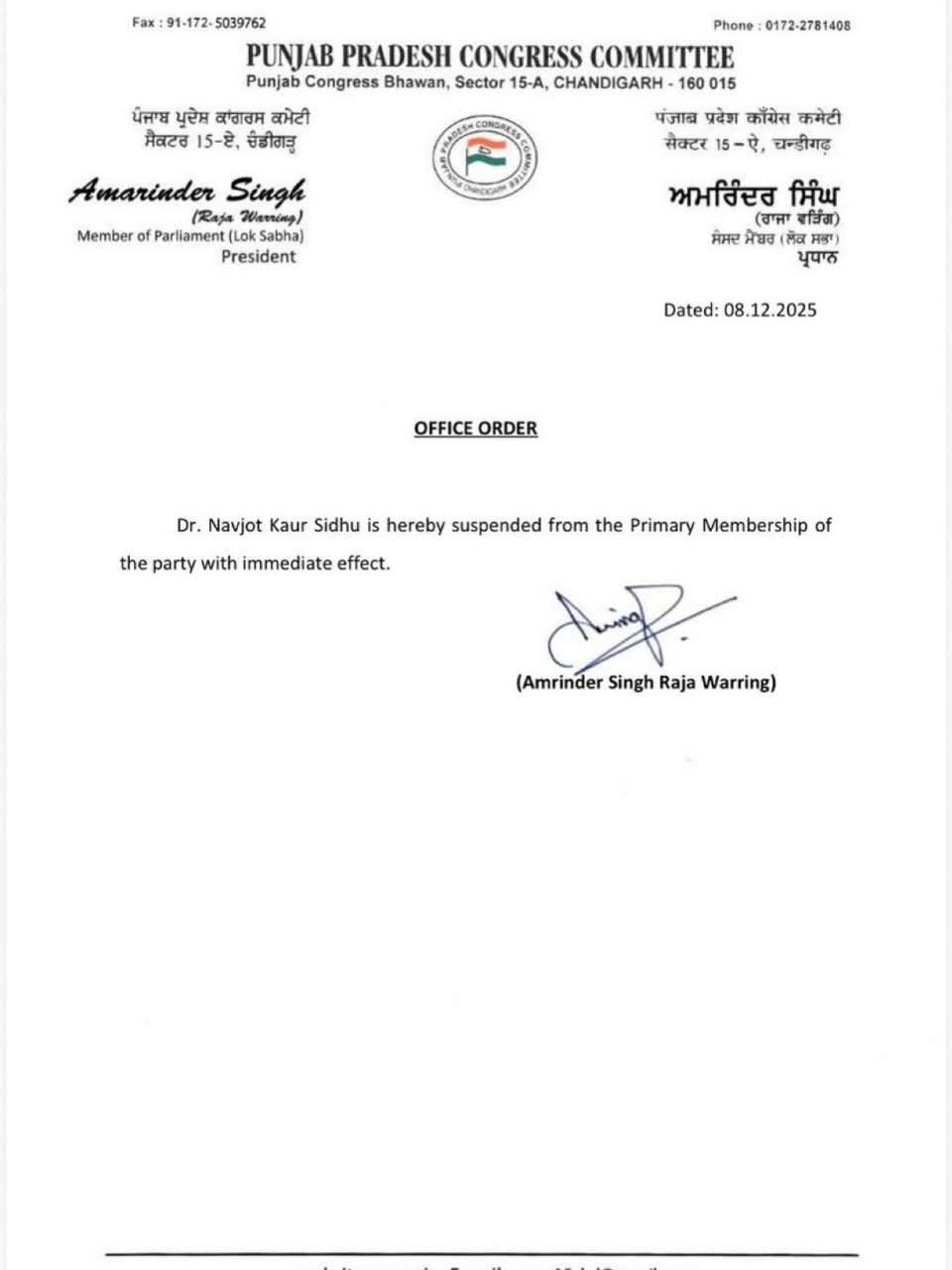ਚੰਡੀਗੜ੍ਹ, 8 ਦਸੰਬਰ – ਨਿਊਜ਼ਲਾਈਨ ਐਕਸਪ੍ਰੈਸ – ਕਾਂਗਰਸ ਪਾਰਟੀ ਨੇ ਨਵਜੋਤ ਕੌਰ ਸਿੱਧੂ ਖਿਲਾਫ ਵੱਡਾ ਐਕਸ਼ਨ ਲਿਆ ਹੈ। ਉਨ੍ਹਾਂ ਨੂੰ ਪਾਰਟੀ ਵਿਚੋਂ ਸਸਪੈਂਡ ਕਰ ਦਿੱਤਾ ਗਿਆ ਹੈ। ਮਿਲੀ ਜਾਣਕਾਰੀ ਮੁਤਾਬਕ ਉਨ੍ਹਾਂ ਖਿਲਾਫ 5 ਕਰੋੜ ਵਾਲੇ ਬਿਆਨ ਮਗਰੋਂ ਕਾਰਵਾਈ ਕੀਤੀ ਗਈ ਹੈ। ਇਸ ਸਬੰਧੀ ਪੰਜਾਬ ਕਾਂਗਰਸ ਪ੍ਰਧਾਨ ਅਮਰਿੰਦਰ ਸਿੰਘ ਰਾਜਾ ਵੜਿੰਗ ਨੇ ਸੋਸ਼ਲ ਮੀਡੀਆ ਰਾਹੀਂ ਜਾਣਕਾਰੀ ਦਿੱਤੀ ਹੈ। ਪੰਜਾਬ ਕਾਂਗਰਸ ਪ੍ਰਧਾਨ ਅਮਰਿੰਦਰ ਸਿੰਘ ਰਾਜਾ ਵੜਿੰਗ ਨੇ ਸਾਬਕਾ ਕ੍ਰਿਕਟਰ ਅਤੇ ਕਾਂਗਰਸੀ ਨੇਤਾ ਨਵਜੋਤ ਸਿੰਘ ਸਿੱਧੂ ਦੀ ਪਤਨੀ ਡਾ. ਨਵਜੋਤ ਕੌਰ ਸਿੱਧੂ ਨੂੰ ਪਾਰਟੀ ਤੋਂ ਮੁਅੱਤਲ ਕਰ ਦਿੱਤਾ ਹੈ। ਕਾਂਗਰਸ ਪ੍ਰਧਾਨ ਅਮਰਿੰਦਰ ਸਿੰਘ ਰਾਜਾ ਵੜਿੰਗ ਨੇ ਉਨ੍ਹਾਂ ਨੂੰ ਪਾਰਟੀ ਦੀ ਮੁੱਢਲੀ ਮੈਂਬਰਸ਼ਿਪ ਤੋਂ ਮੁਅੱਤਲ ਕਰਨ ਦਾ ਹੁਕਮ ਜਾਰੀ ਕੀਤਾ। ਉਨ੍ਹਾਂ ਨੂੰ ਸਸਪੈਂਡ ਕਰਨ ਦਾ ਕੋਈ ਕਾਰਨ ਨਹੀਂ ਦੱਸਿਆ। ਪਿਛਲੇ ਕੁਝ ਦਿਨਾਂ ਤੋਂ ਨਵਜੋਤ ਕੌਰ ਸਿੱਧੂ ਪੰਜਾਬ ਵਿੱਚ ਕਾਂਗਰਸ ਅਤੇ ਇਸਦੇ ਸੀਨੀਅਰ ਨੇਤਾਵਾਂ ਵਿਰੁੱਧ ਸਿੱਧੇ ਬਿਆਨ ਦੇ ਰਹੇ ਹਨ, ਜਿਸ ਨਾਲ ਪਾਰਟੀ ਅੰਦਰ ਸਖ਼ਤ ਵਿਰੋਧ ਹੋ ਰਿਹਾ ਸੀ।