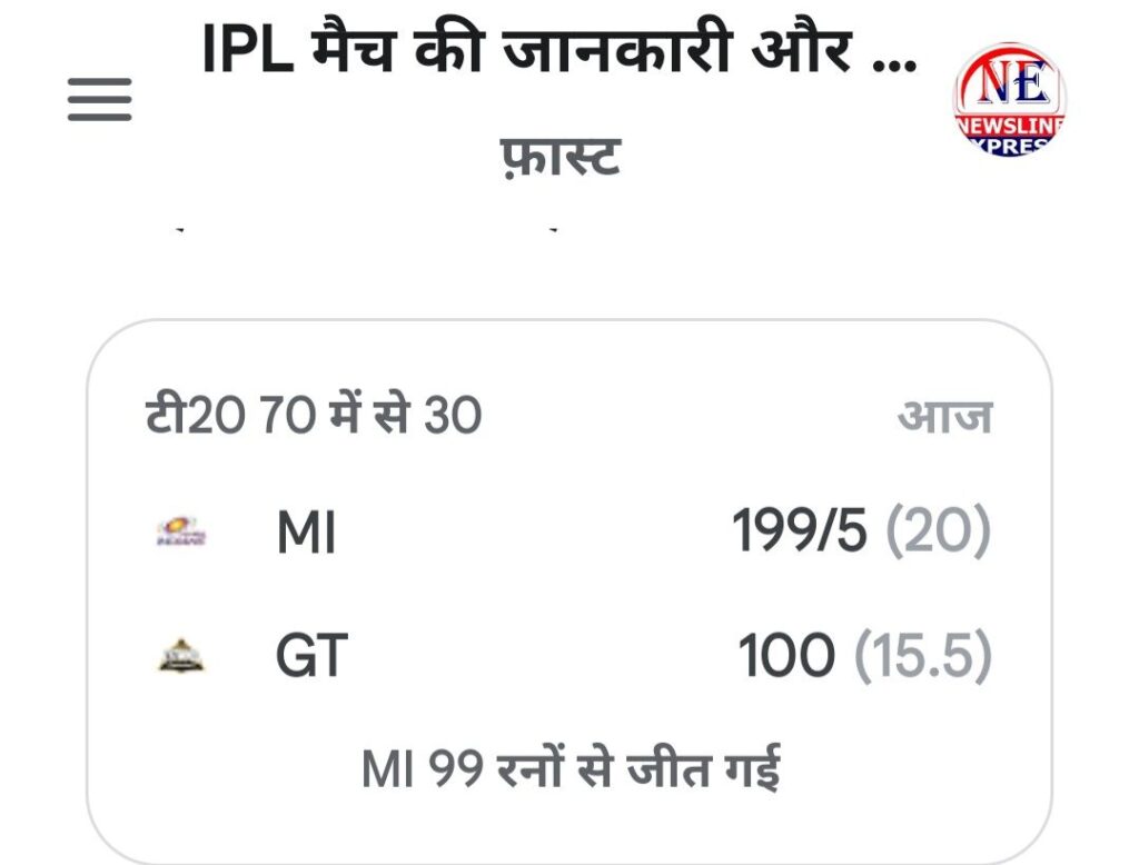 ЁЯЪйрдЖрдЬ (20 рдЕрдкреНрд░реИрд▓ 2026) рдЦреЗрд▓реЗ рдЧрдП IPL 2026 рдХреЗ 30рд╡реЗрдВ рдореИрдЪ рдореЗрдВ рдореБрдВрдмрдИ рдЗрдВрдбрд┐рдпрдВрд╕ (MI) рдиреЗ рдЧреБрдЬрд░рд╛рдд рдЯрд╛рдЗрдЯрдиреНрд╕ (GT) рдХреЛ 99 рд░рдиреЛрдВ рдХреЗ рдмрдбрд╝реЗ рдЕрдВрддрд░ рд╕реЗ рд╣рд░рд╛ рджрд┐рдпрд╛ рд╣реИред