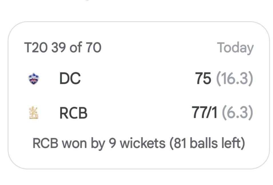 เคจเค เคฆเคฟเคฒเฅเคฒเฅ / เคจเฅเคฏเฅเฅเคฒเคพเคเคจ เคเคเฅเคธเคชเฅเคฐเฅเคธ : IPL 2026 เคเฅ 39เคตเฅเค เคฎเฅเคเคพเคฌเคฒเฅ เคฎเฅเค เคฐเฅเคฏเคฒ เคเฅเคฒเฅเคเคเคฐเฅเคธ เคฌเฅเคเคเคฒเฅเคฐเฅ (RCB) เคจเฅ เคฆเคฟเคฒเฅเคฒเฅ เคเฅเคชเคฟเคเคฒเฅเคธ (DC) เคเฅ เคเคเคคเคฐเคซเคพ เคฎเฅเคเคพเคฌเคฒเฅ เคฎเฅเค 9 เคตเคฟเคเฅเค เคธเฅ เคฌเฅเคฐเฅ เคคเคฐเคน เคนเคฐเคพ เคฆเคฟเคฏเคพ เคนเฅเฅค เค เคฐเฅเคฃ เคเฅเคเคฒเฅ เคธเฅเคเฅเคกเคฟเคฏเคฎ เคฎเฅเค เคเฅเคธ เคเฅเคคเคเคฐ เคชเคนเคฒเฅ เคเฅเคเคฆเคฌเคพเคเฅ เคเคฐเคจเฅ เคเคพ RCB เคเฅ เคเคชเฅเคคเคพเคจ เคฐเคเคค เคชเคพเคเฅเคฆเคพเคฐ เคเคพ เคซเฅเคธเคฒเคพ เคชเฅเคฐเฅ เคคเคฐเคน เคธเคนเฅ เคธเคพเคฌเคฟเคค เคนเฅเคเฅค